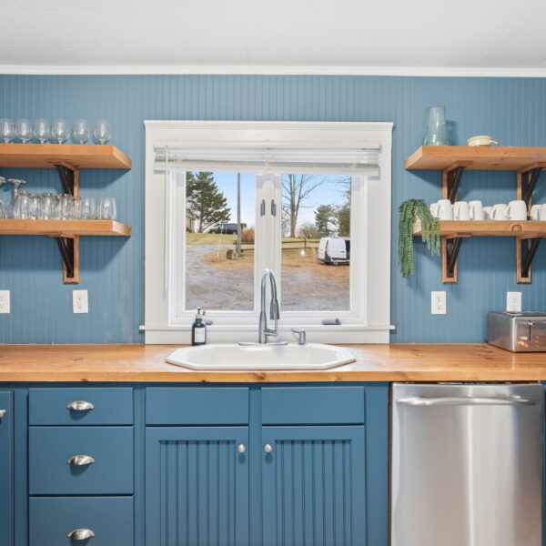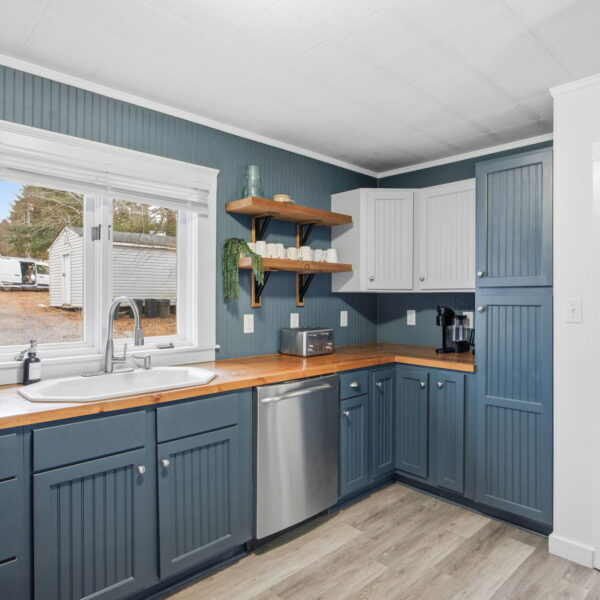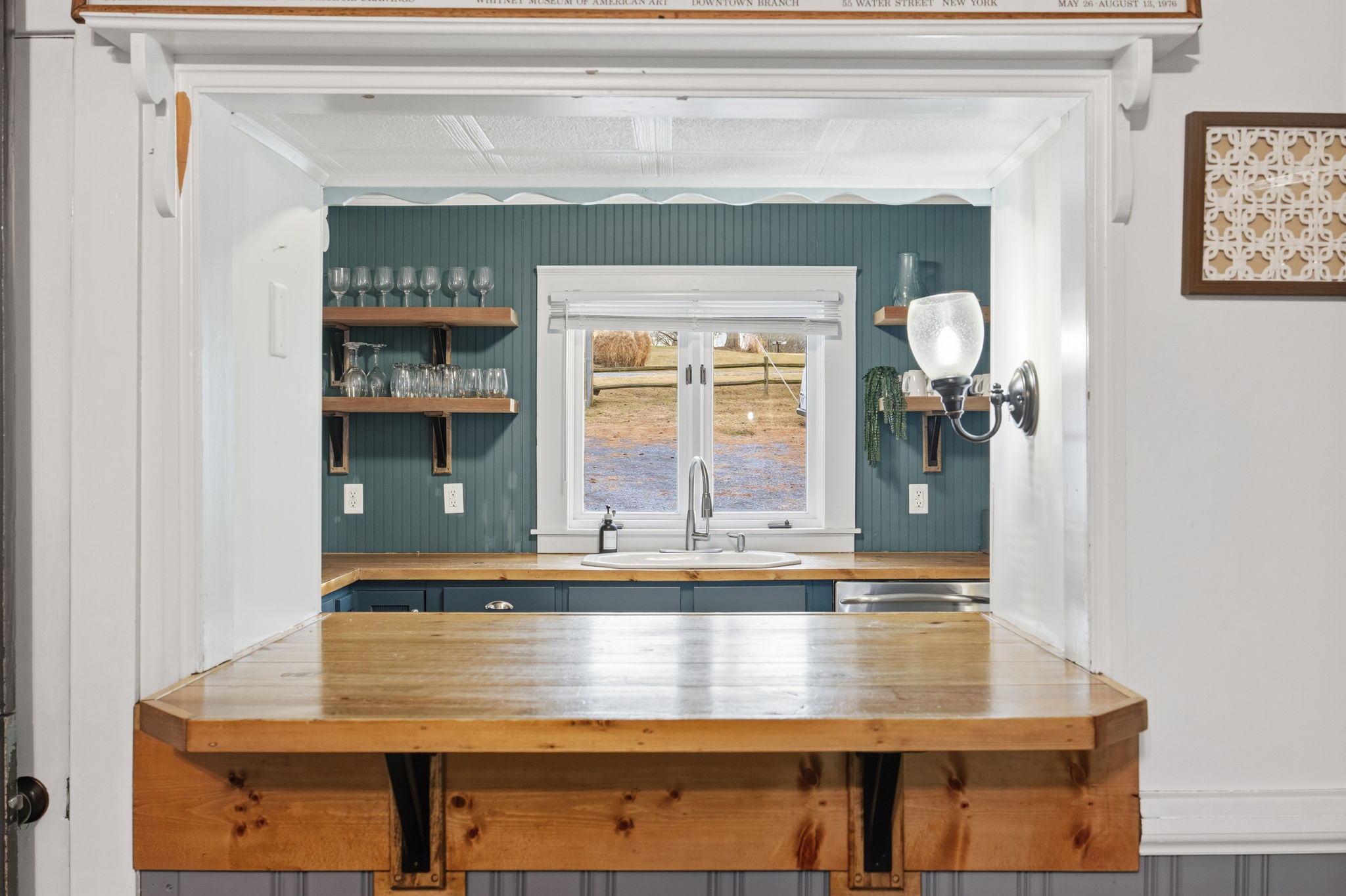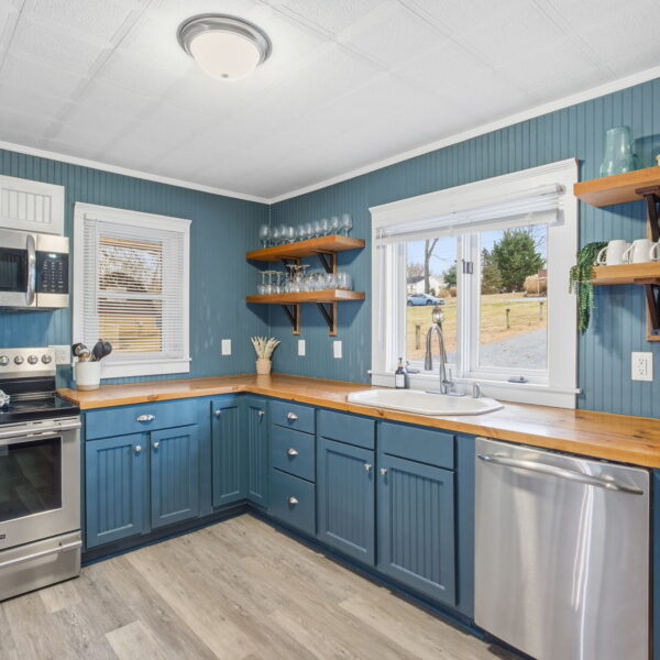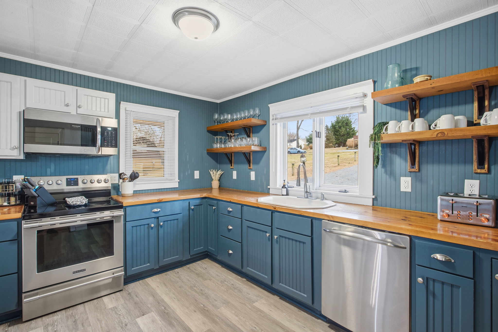 • Updated kitchen with stainless steel appliances, abundance of cabinetry, custom built wood countertops, and stylish shelving.