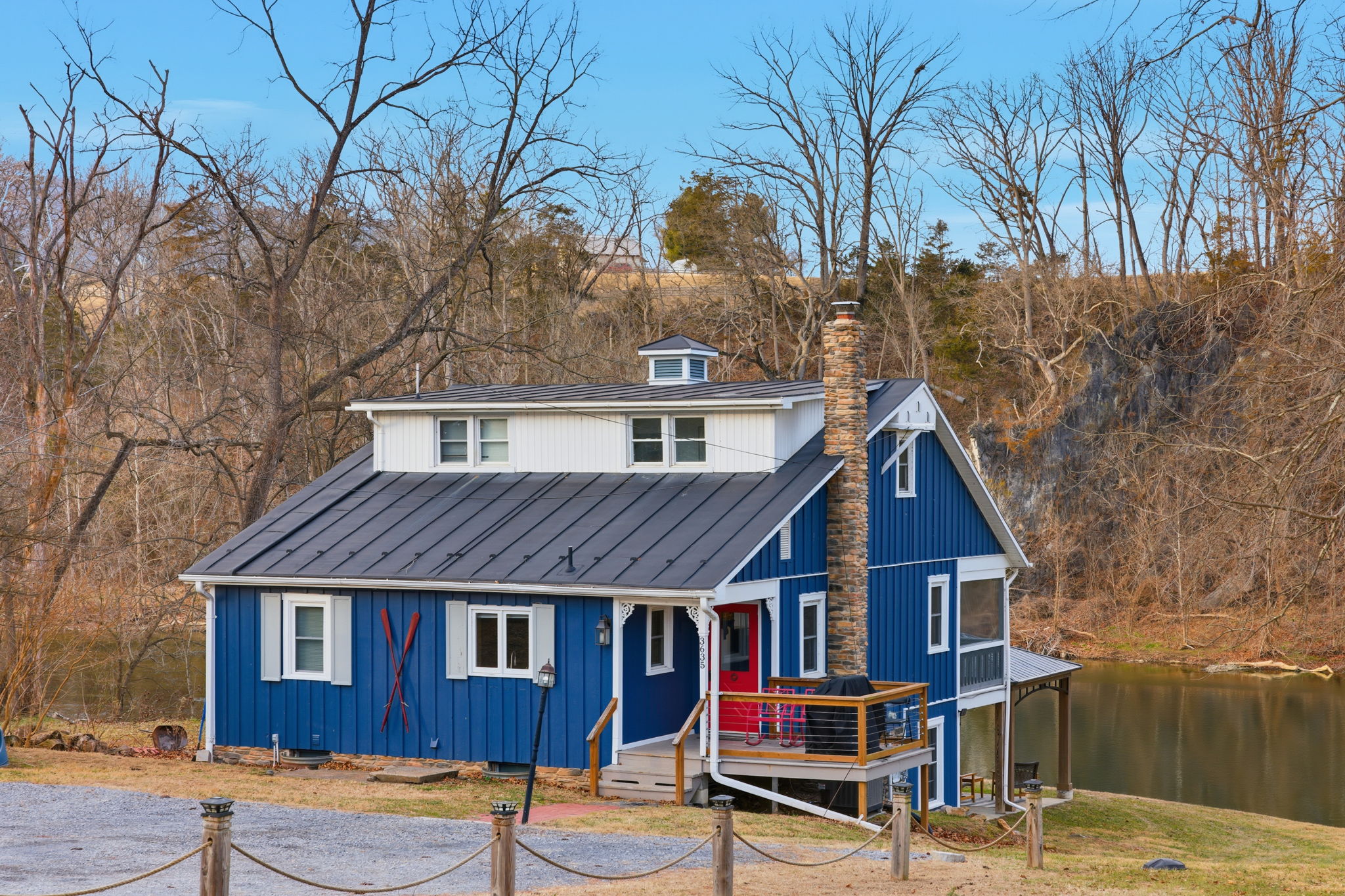 • Spacious screened-in porch overlooking Shenandoah River with Hot Tub and rocking chairs, barstools to enjoy a cold beverage on a hot day overlooking the rive